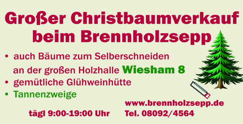 Der Christbaumverkauf beim Brennholzsepp beginnt am 26. November 2025, dann täglich von 9 bis 19 Uhr auf dem Gelände der Holzlagerhalle.